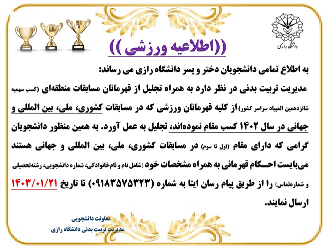 1650 اطلاعیه تجلیل از قهرمانان ورزشی در سطوح مختلف به اطلاع تمامی دانشجویان دختر و پسر دانشگاه رازی می رساند: مدیریت تربیت بدنی در نظر دارد به همراه تجلیل از قهرمانان مسابقات منطقه ای (کسب سهمیه...