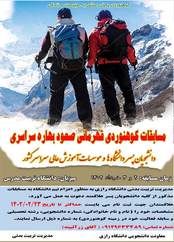 714 فراخوان مسابقات کوهنوردی مسابقات کوهنوردی قهرمانی صعود بهاره دانشجویان پسر دانشگاه ها و موسسات آموزش عالی کشور جهت دریافت آیین نامه عمومی و فنی اینجا کلیک کنید. ذخیره ادرس در حافظه موقت لینک...