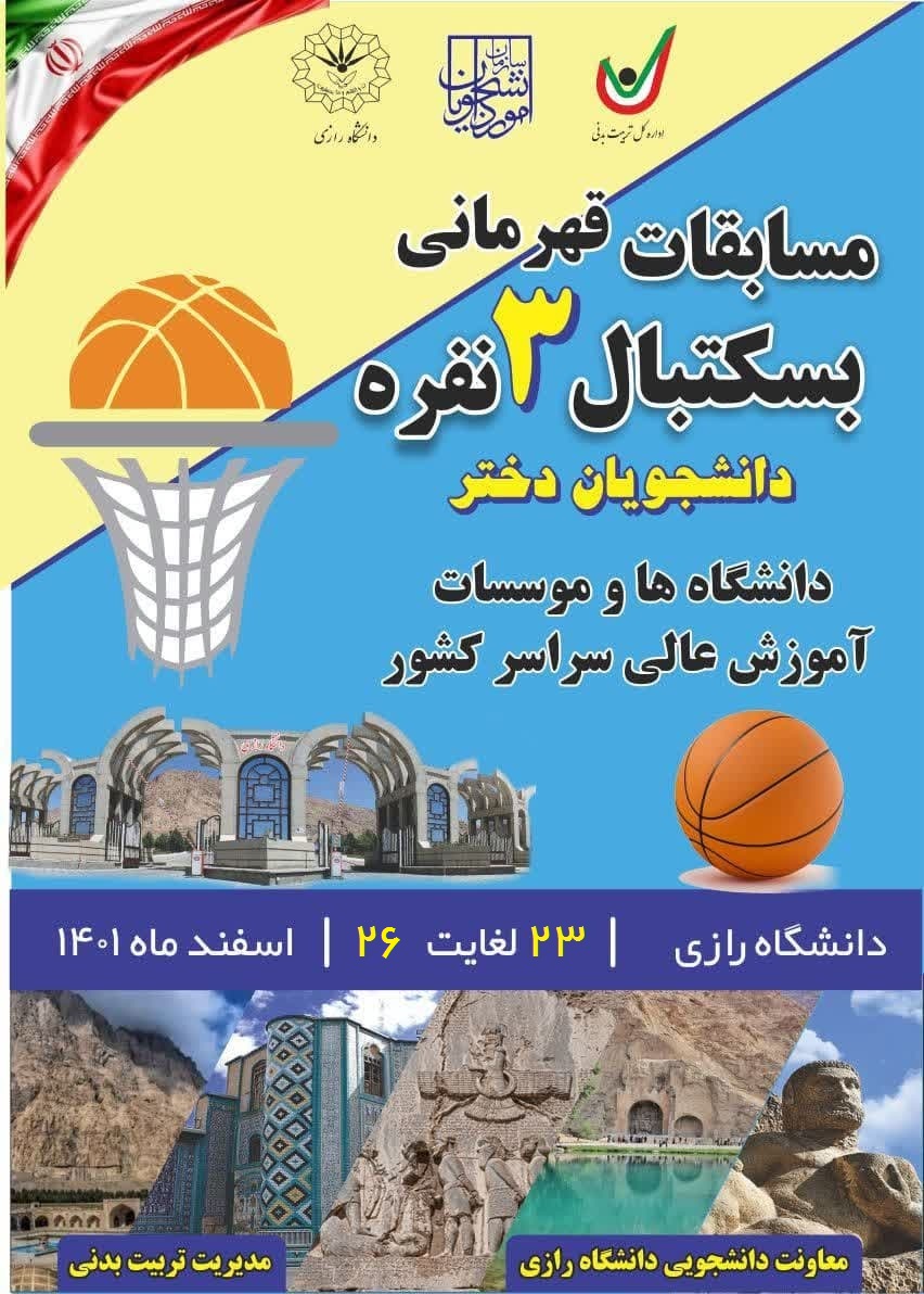 971 مدیریت تربیت بدنی دانشگاه رازی برگزار می نماید: مسابقات قهرمانی بسکتبال دانشجویان دختر دانشگاه ها و موسسات آموزش عالی سراسر کشور به میزبانی دانشگاه رازی مسابقات قهرمانی بسکتبال دانشجویان دختر...