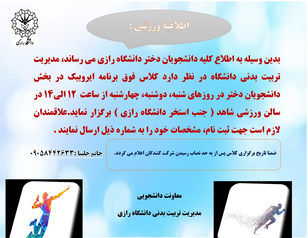 790 مدیریت تربیت بدنی دانشگاه رازی برگزار می نماید: برگزاری کلاس فوق برنامه ایروبیک دانشجویان دختر ذخیره ادرس در حافظه موقت لینک کوتاه: