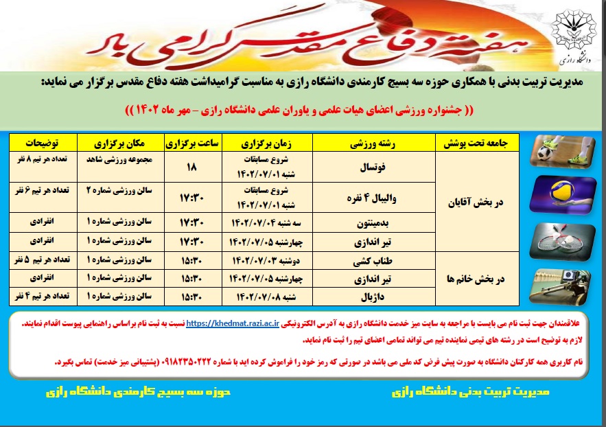 مدیریت تربیت بدنی دانشگاه رازی در راستای اجرای تقویم ورزشی سالانه، در نظر دارد به مناسبت گرامیداشت هفته تربیت بدنی و ورزش، جشنواره ورزشی درون دانشگاهی در بخش دانشجویان برگزار...