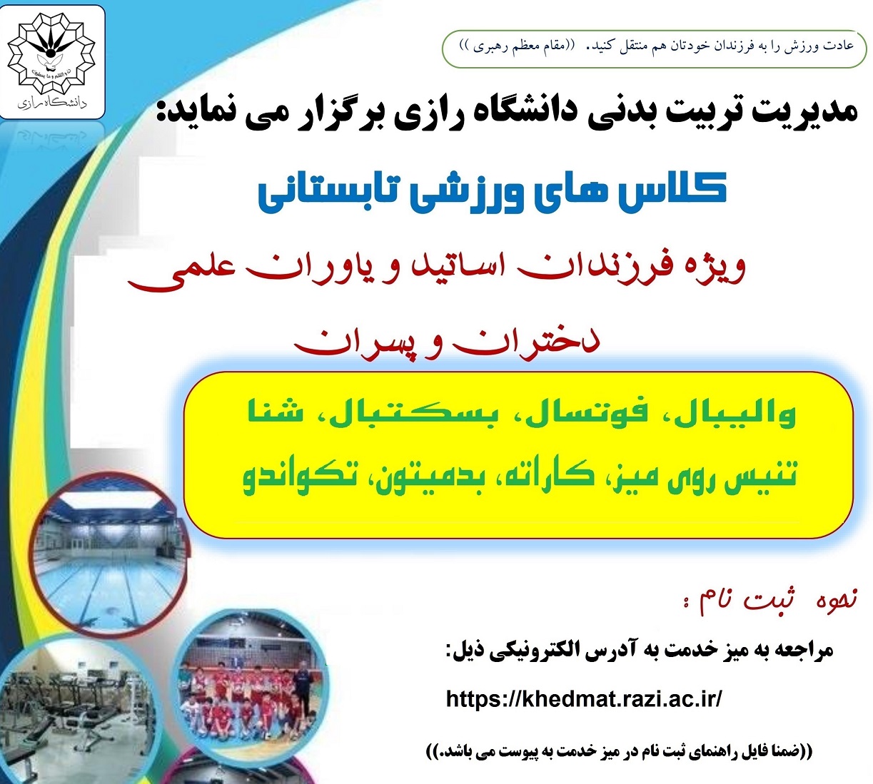 1113 مدیریت تربیت بدنی دانشگاه رازی برگزار می نماید: برگزاری کلاس های اوقات فراغت ورزشی فرزندان اعضای هیات علمی و یاوران علمی دانشگاه رازی مدیریت تربیت بدنی دانشگاه در نظر دارد جهت پرکردن اوقات...