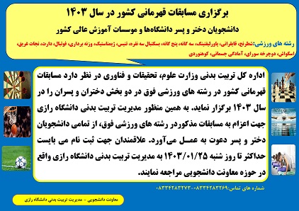 966 مدیریت تربیت بدنی دانشگاه رازی برگزار می نماید: مسابقات قهرمانی بسکتبال دانشجویان دختر دانشگاه ها و موسسات آموزش عالی سراسر کشور به میزبانی دانشگاه رازی مسابقات قهرمانی بسکتبال دانشجویان دختر...