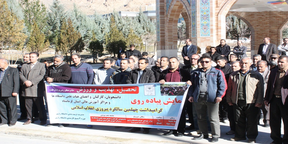 به مناسبت فرارسیدن ایام ا... دهه مبارک فجر و چهلمین سالگرد پیروزی انقلاب اسلامی، همایش پیاده روی با حضور دانشگاه ها و مراکز آموزش عالی استان صبح امروز (شانزدهم بهمن ماه ۱۳۹۷) به همت مدیریت تربیت بدنی دانشگاه رازی و حوزه ۳ بسیج کارمندی در پردیس طاق بستان دانشگاه رازی برگزار گردید..