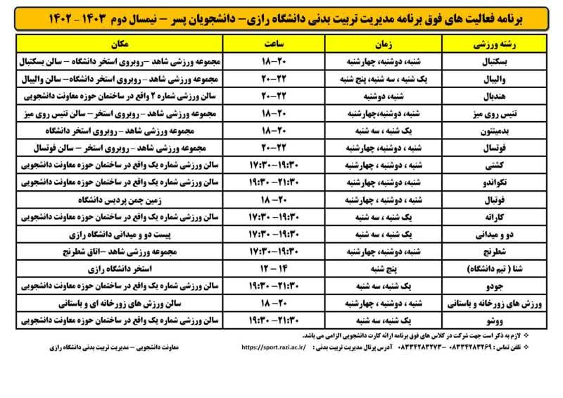 برنامه فعالیتهای فوق برنامه مدیریت تربیت بدنی دانشگاه رازی - دانشجویان پسر - نیم سال دوم 1403-1402