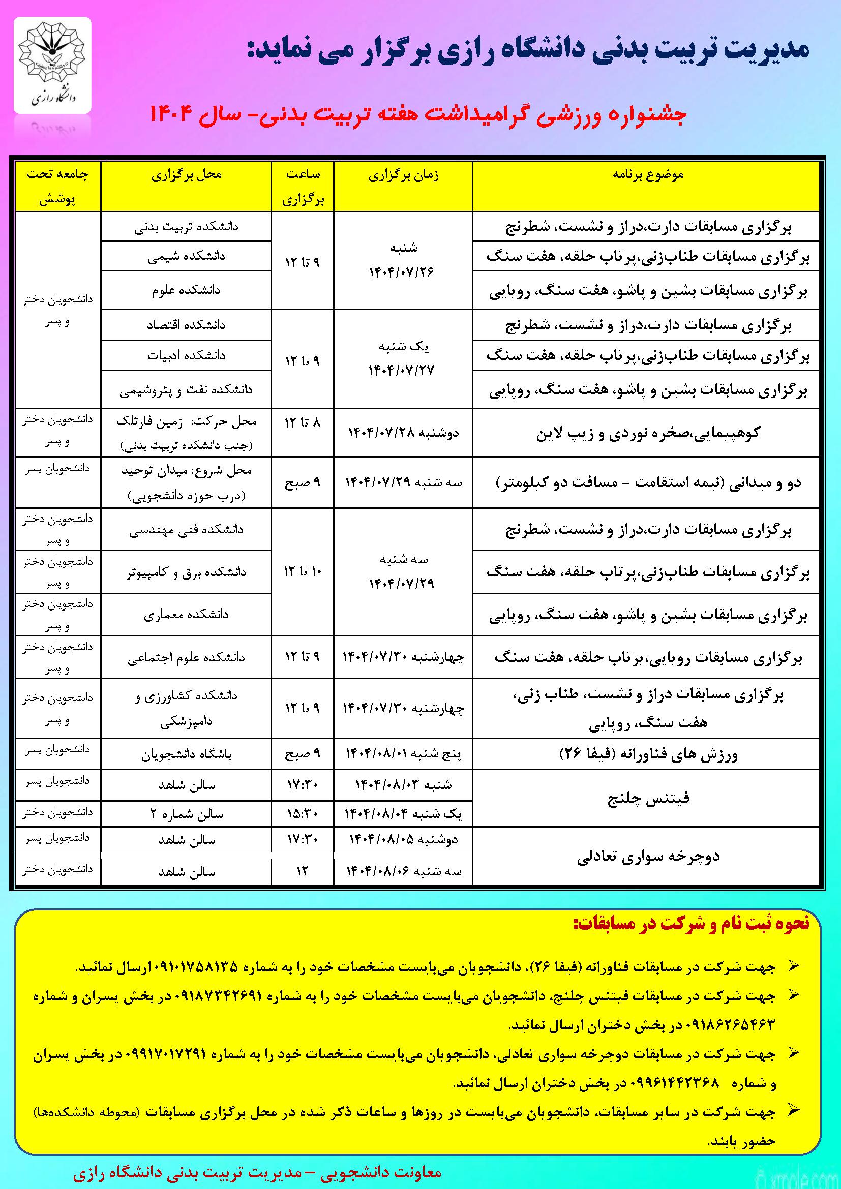 مدیریت تربیت بدنی دانشگاه در نظر دارد به مناسبت گرامیداشت هفته تربیت بدنی جشنواره ورزشی در هر دو بخش دانشجویان دختر و پسر برگزار نماید. به همین منظور به پیوست جدول زمانبندی مسابقات مذکور به حضور ارسال میگردد. علاقمندان جهت ثبت نام و شرکت در مسابقات می توانند مشخصات خود را به شماره های اعلام شده در اطلاعیه ارسال نمایند.