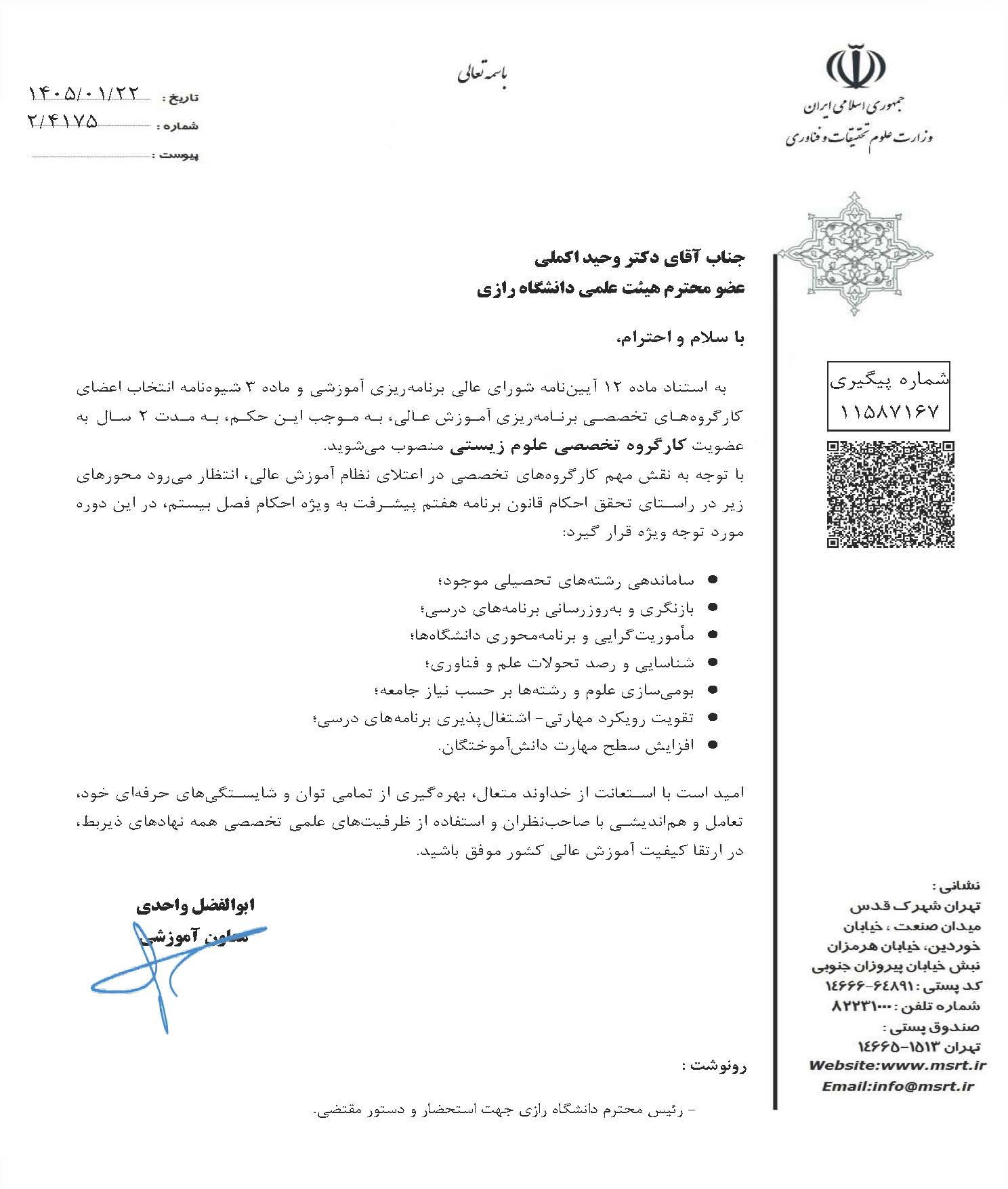 حکم عضویت آقای دکتر وحید اکملی در کارگروه تخصصی علوم زیستی