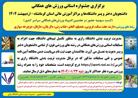 5984 برنامه فعالیت های فوق برنامه دانشجویان دختر و پسر دانشگاه رازی- نیمسال دوم 1403-1402 شناسه : 5035813
